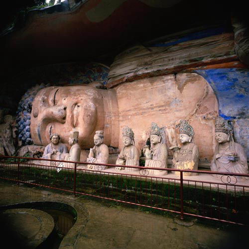 這是擂鼓臺中洞,又名大萬伍佛洞。是一座武周禪宗窟,中國佛教的禪宗是以專修禪定為主的教派。“禪定”就是安定而止息殺慮的意思。洞頂作穹隆形,并有裝飾華麗的蓮花藻井,造像是一佛二菩薩,主佛為雙膝下垂而坐的彌勒佛,壁基有二十五尊高浮雕羅漢群像,從南壁西起到北壁西止。羅漢群像構(gòu)成一個(gè)半環(huán)形裝飾帶,羅漢群像均羅漢身旁都刻有一段從《付法藏因緣傳》里摘錄的經(jīng)文介紹該羅漢的身世及特點(diǎn)。所刊經(jīng)文中多雜以武周新字,這是是武周時(shí)期禪宗所經(jīng)營的洞窟。