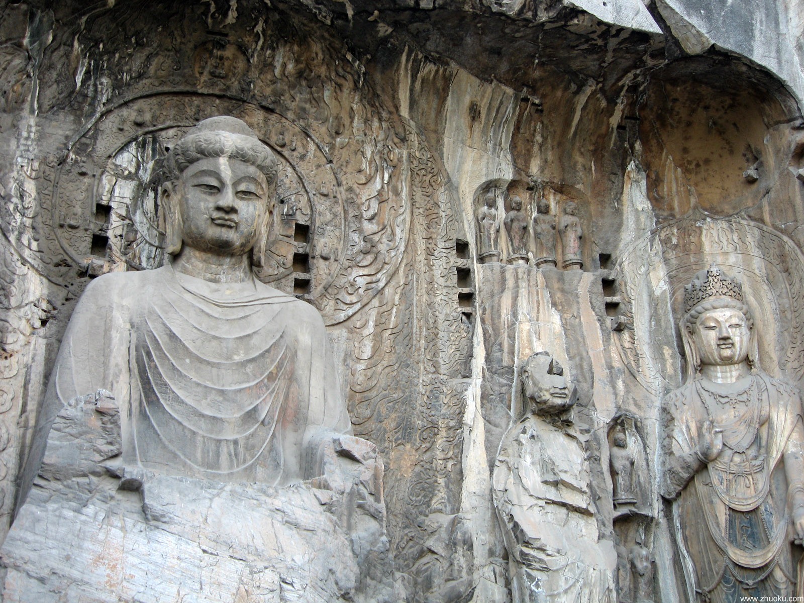 奉先寺的九軀大像的背后有很多長方形的小龕,這是大約在宋、金時(shí)代,人們?yōu)榱吮Wo(hù)大像龕,依龕修建了木結(jié)構(gòu)屋檐式建筑,這些建筑影響了佛像的通風(fēng),加速了佛像的風(fēng)化,因而后來被拆除。