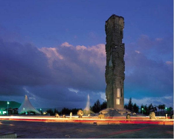 圍繞圖騰柱的中心雕塑區(qū),形成三圈石硨,氣勢宏大、形象獨特。第一圈有蒼龍、白虎、朱雀、玄武四季標(biāo)識與日晷24節(jié)氣雕塑;第二圈表現(xiàn)盤古開天地、女媧補天、嫦娥奔月、弄天舞干戚、大禹治水、牛郎織女、后羿射日、夸父追日等八個遠(yuǎn)古神話;第三圈是反映天文、人、動物、植物萬物生靈雕刻。圖騰柱和雕塑群渾然一體,構(gòu)成強烈的中國古天文意識和東方神秘色彩。廣場外圍設(shè)計的五組白色風(fēng)帆式的尖頂帳篷及大型彩色噴泉,給具有古老文化意蘊的雕塑增添了現(xiàn)代氣息。