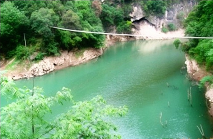 距松柏鎮(zhèn)24公里,該湖位于海拔500米的高山上,水深30米,長12公里,是一個水庫。湖口有一個高54米、寬百余丈的瀑布,還有一道鐵索甩橋,橋面晃動得十分厲害,要走過去是需要勇氣的。在湖邊的山壁上還有兩股溫泉,現(xiàn)已修建了溫泉池,可供游人沐浴。