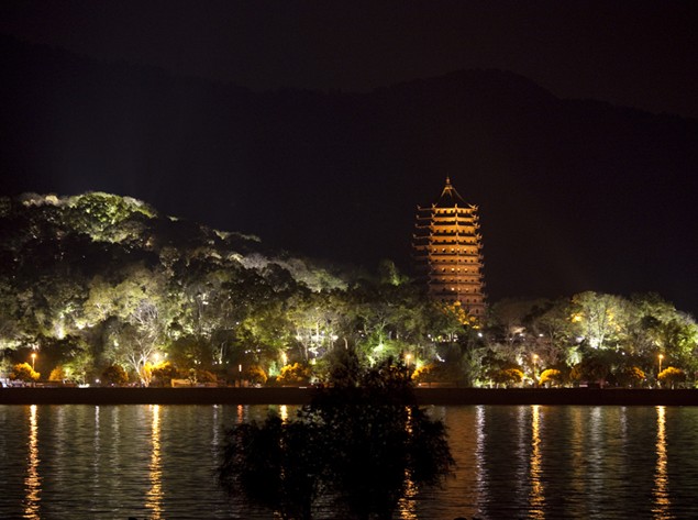 位于錢塘江畔月輪山上,是北宋時吳越王為鎮(zhèn)錢塘潮而建。此地原為五代吳越國王的南果園。北宋開寶三年(970年),錢弘椒舍園造塔,并建塔院,建塔的目的是為了鎮(zhèn)壓江潮。時錢塘江上“舟楫輻輳,望之不見其首尾”。