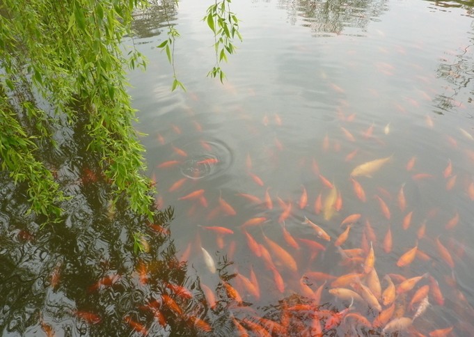 還有種說(shuō)法:“花港觀魚(yú)”四字為清康熙皇帝手跡。康熙一生崇信佛教,向有“佛爺”、“善人”之稱。他孫子乾隆爺也崇尚“好生之德”。然而,在漢字里,三點(diǎn)為水,四點(diǎn)為火。繁體“魚(yú)”字底部的四點(diǎn),本為火字,魚(yú)遇水而生,遇火必死?;实鄄蝗桃?jiàn)魚(yú)死,便將碑文中“魚(yú)”字底部的四點(diǎn)改寫成了三點(diǎn),意在讓魚(yú)永遠(yuǎn)歡快地生活在水里,以示皇恩浩蕩,澤被萬(wàn)物之意。這也給后人留下了一段有趣的典故。