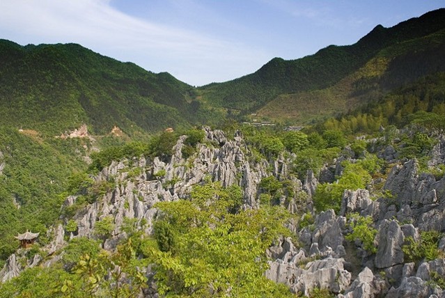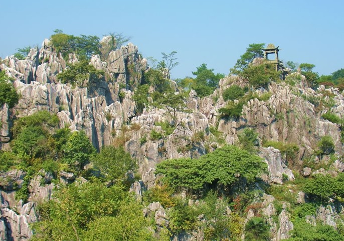 千島湖石林景區(qū)面積20平方公里,是中國(guó)四大石林之一。它位于杭州地區(qū)西邊的淳安縣千島湖,其面積之廣,規(guī)模之大,景觀之奇在華東地區(qū)堪稱一絕,被稱為“華東第一石林”。千島湖石林是一個(gè)迷宮式的溶巖地貌景觀,由藍(lán)玉坪、玳瑁嶺、西山坪組成。區(qū)內(nèi)群峰壁立,層巒疊嶂,石壁、石柱、石筍、石洞等體態(tài)紛呈,各具特色,有“華東第一石林”的美譽(yù)。是我國(guó)四大石林之一(另三大石林為云南路南石林,四川興文石林,福建大湖石林)。千島湖石林主要有藍(lán)玉坪、玳瑁嶺和西山坪三處。這里海拔650余米,古時(shí)這里稱“白云山”。在這崇山峻嶺間,常有云霧茶的產(chǎn)地。這片石林屬迷宮式喀斯特地貌,石峰峭立,千姿百態(tài),峰回路轉(zhuǎn)?;蛉暥.?dāng),或山窮水盡,或豁然開朗,或茫然不知所歸。大自然的造化真是奇特,有的移步換峰形,有的一巖多景,鬼斧神工,妙趣橫生。
