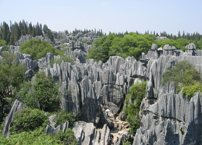 石林的路是迷離得出奇,在半平方公里的范圍內(nèi),游步道有一萬(wàn)余米,石隙間的小路曲折回環(huán),一不小心往往走回原處,有說(shuō)像“迷魂陣”,有說(shuō)似“八卦陣”,反正也象也不象。有石縫,瘦者可長(zhǎng)軀而過(guò),胖者則要提心吊膽;一、兩百人散落其間,往往只聽聲音不見人,好像相互在捉迷藏。在石林邊緣,是春云浮谷的崖壁,沿著壁間小路攀緣而下,便進(jìn)入一“琴音洞”。洞口寬敞,涼風(fēng)瑟瑟,水聲潺潺,綠樹蔽蔭。人們把這里譽(yù)為“華東第一石林”,這是恰如其分,有位著名詩(shī)人迷戀石林魂麗多姿,冠于東南,兩度來(lái)游,欣然命筆,喜賦七律,一道云:“再度淳安訪石林,輕車緩緩入山徑。玲瓏剔透經(jīng)風(fēng)雨,劍拔弩張泣鬼神。應(yīng)謝媧皇千古手,長(zhǎng)留華夏九洲珍。分明一派宋人畫,斧壁又兼折帶皴。千島湖石林,不僅使我們領(lǐng)略到祖國(guó)山川的壯麗,感受到大自然造物之奧妙,還能使人們?cè)黾硬簧僮匀粴v史知識(shí)。