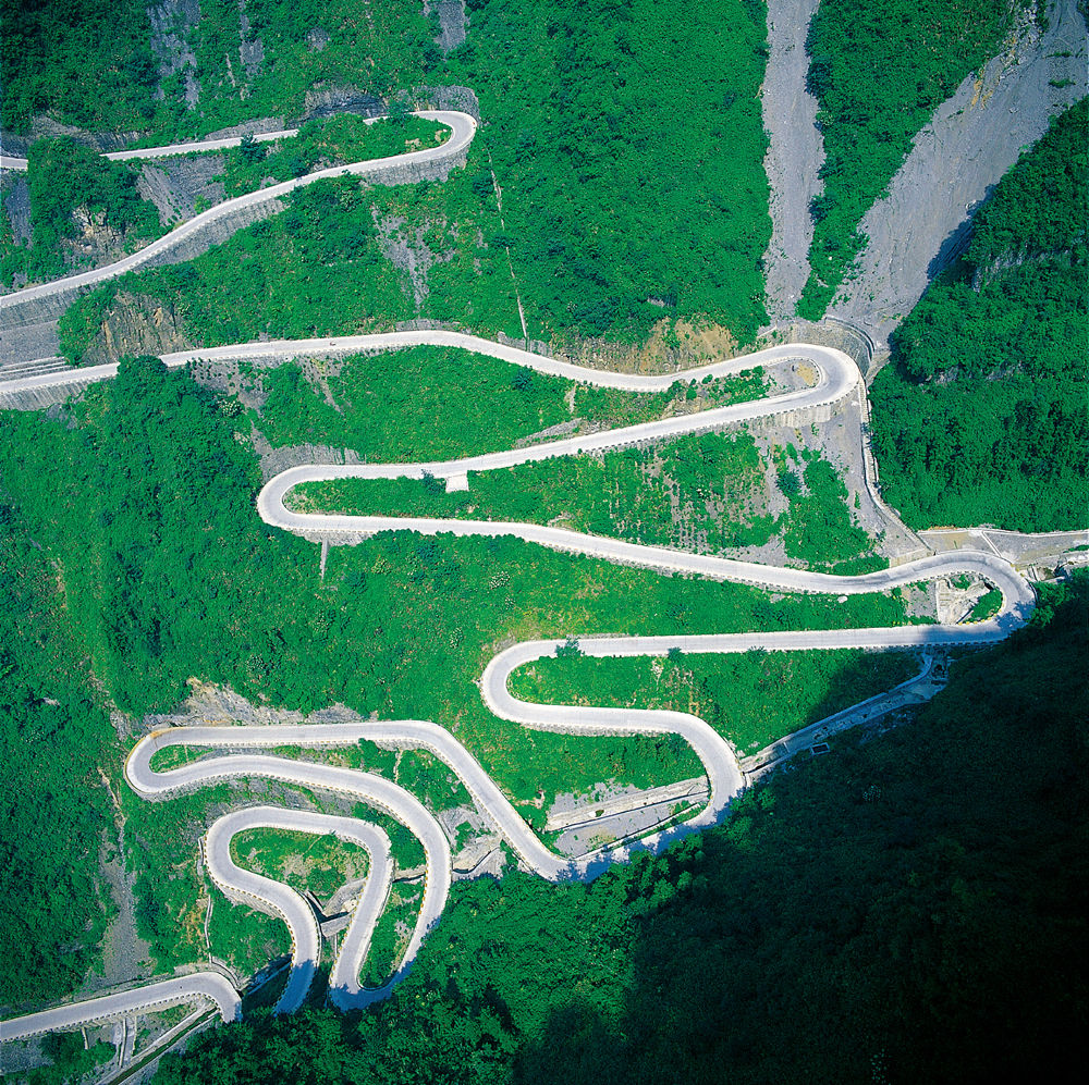 天門洞以其接地通天的態(tài)勢,成為人們心中通天的門戶,而通往天門洞的盤山公路也因此被稱為“通天大道”。更為神奇的是,在公路竣工的時候,人們驚奇地發(fā)現(xiàn),這條順山勢修建的通天大道剛好九十九個彎,暗合了“天有九重,云有九霄”之意。 通天大道以進山時的標志門為起點,一直通達天門洞腳下,全長 10.77 公里 ,但就在這么短的距離里,它的海拔卻從 200 米 急劇提升到了 1300 米,大道兩側絕壁千仞,空谷幽深,180 度的急彎此消而彼,層層疊起,“ 堪稱天下第一公路奇觀 ”。中國書法協(xié)會常務副會長沈鵬先生走過通天大道后欣然為其題字“曲道通天”,字體遒勁挺拔,與通天大道的奇絕天下相融為一體。通天大道于 1998 年開始修建,因天門山獨特的地質和氣候所局限,至 2005年全面貫通,歷時八年,共耗資 1 億元人民幣。整個工程充滿著艱辛卓絕,它凝聚著全體施工人員的智慧和心血,其勢驚險奇絕,蕩氣回腸,以蜿蜒迂回穿行于山體絕壁之天險而成為天下第一公路奇觀。