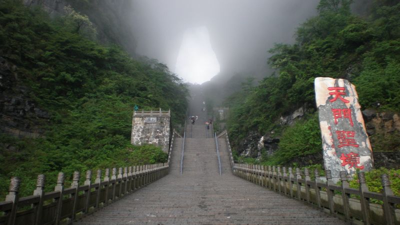 天門洞位于天門山山體的中上部,為巨型穿山石洞,是世界上最高海拔的天然穿山溶洞,海拔1300米,其高131.5米,寬57米,深60米,洞口最窄處28.03米。其海拔高度和飛嵌絕壁的險要位置,在世界上實屬罕見。它似明鏡高懸,懸空危立,終年吞云吐霧,蔚為壯觀中更加神秘莫測?!∵€有奇者,天門洞內一年四季總是滿空雨珠,這就是傳說中用口接四十八滴便能成仙的“ 梅花雨”,其源頭是天門洞頂由八尺功德水中的一尺所形成的“靈泉”。梅花雨飄飄灑灑,漫天飛舞,晶瑩透亮,清涼甘甜,成了天門洞的一無可挑剔的勝景。
