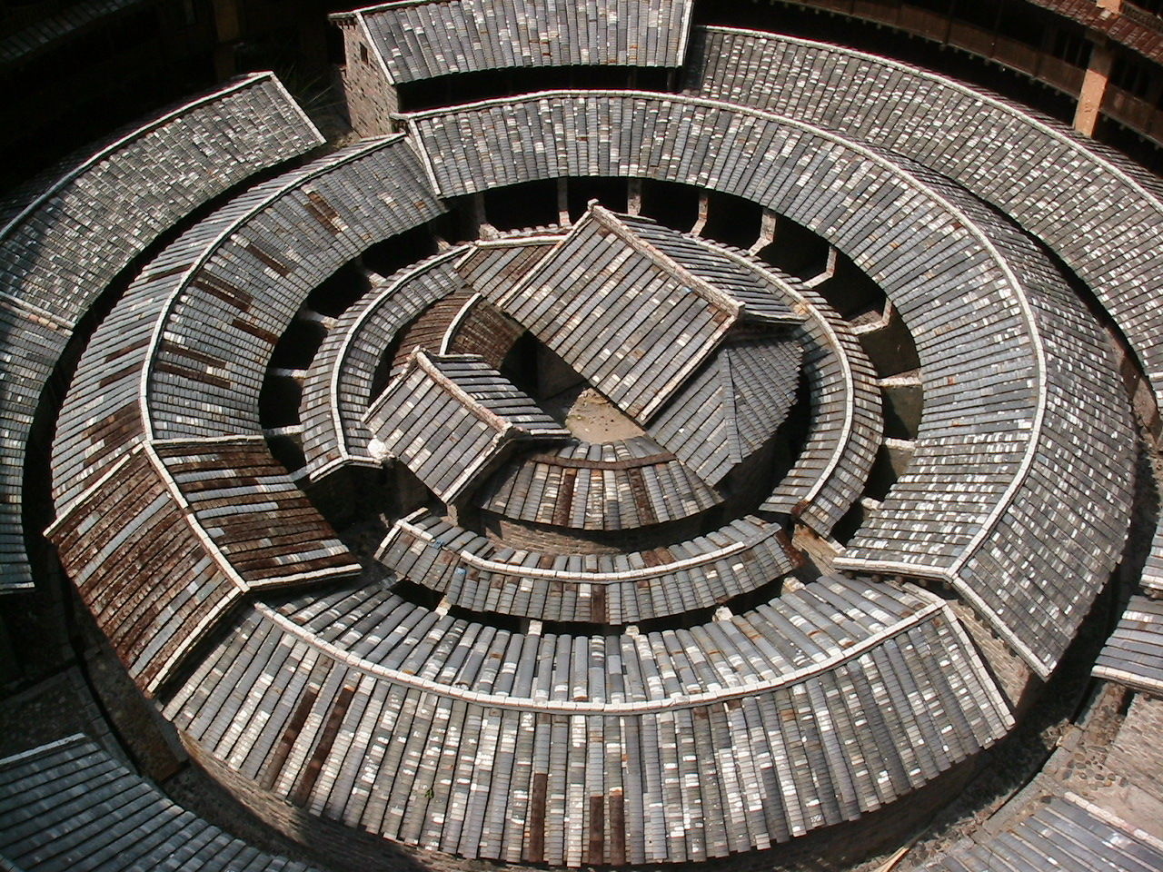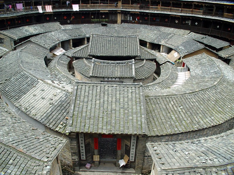 圓形土樓是客家民居的典范,它就像地下冒出來的“蘑菇”,又如同自天而降的“飛碟”,圓樓都由二三圈組成,由內(nèi)到外,環(huán)環(huán)相套,外圈高十余米,四層,有一二百個房間,一層是廚房和餐廳,二層是倉庫,三、四層是臥室;二圈兩層有幾十個房間,一般是客房,當中一間是祖堂,是居住在樓內(nèi)的幾百人舉行婚喪和慶典的場所。樓內(nèi)還有水井、浴室、磨房等設(shè)施。土樓采用當?shù)厣梁恢?,不需鋼筋水泥,墻的基礎(chǔ)寬達三米,底層墻厚1.5米,向上依次縮小,頂層墻厚不小于0.9米。沿圓形外墻用木板分隔成許多房間,其內(nèi)側(cè)為走廊。