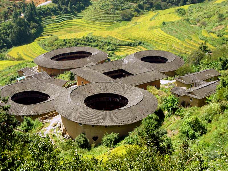 福建省永定縣位于閩西的龍巖地區(qū),這里分布著歷史悠久、風(fēng)格獨特的客家民居建筑群,它們被統(tǒng)稱為“永定客家土樓”。土樓分為圓樓和方樓兩種,永定全縣有圓樓360余座,方樓4000余座,永定客家土樓是世界文化遺產(chǎn)之一。