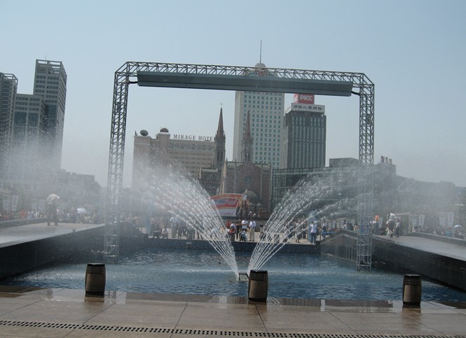 進(jìn)入廣場后跨過二座平行的小橋,便是亞洲最大的音樂噴泉和超大水幕電影??偼顿Y4000萬元的水景系統(tǒng)呈“L”型,總長200米,主噴泉長達(dá)95米,與廣場的中心舞臺(tái)遙相呼應(yīng),主噴泉的核心是兩座橋之間的號(hào)稱“擎天柱”的噴泉,中心的一支大口徑的噴嘴射出直徑達(dá)38毫米的水柱,噴高可達(dá)40米,形成一柱擎天之勢;整個(gè)音樂噴泉有2000個(gè)噴嘴,400多臺(tái)水泵,全部由電腦控制,采用目前國際上最先進(jìn)的高壓氣泵式激光音樂噴泉技術(shù),噴泉在激光和音樂的配合下,能高速噴出一個(gè)個(gè)晶瑩透亮的水柱、水花、能組合出令人眼花繚亂的“高崗花式”、“華爾茲花式”、“蝴蝶展翅式”等幾百種噴泉花式,形成一個(gè)美不勝收的“水世界”;同時(shí)與噴泉交相輝映的水燈也大放異彩,隨著音樂的變化,一個(gè)赤橙黃綠青藍(lán)紫的“水光舞臺(tái)”,通透明亮,宛如仙境,令人目不暇接,贊嘆不已。在廣場的兩側(cè),噴射的水墻組成一個(gè)高20米,寬60米的扇形水幕,對(duì)面的建筑上射過來的一道光束和激光投射在晶瑩透明的水幕上,水珠如霰如霧,色彩斑斕的光束與水幕交相輝映,形成一組組生動(dòng)活潑的畫面——這就是天一廣場的大屏幕水幕電影,巨大的水幕電影中景觀人像清晰可感,恍如夢境,又仿佛觸手可及,令人驚奇。