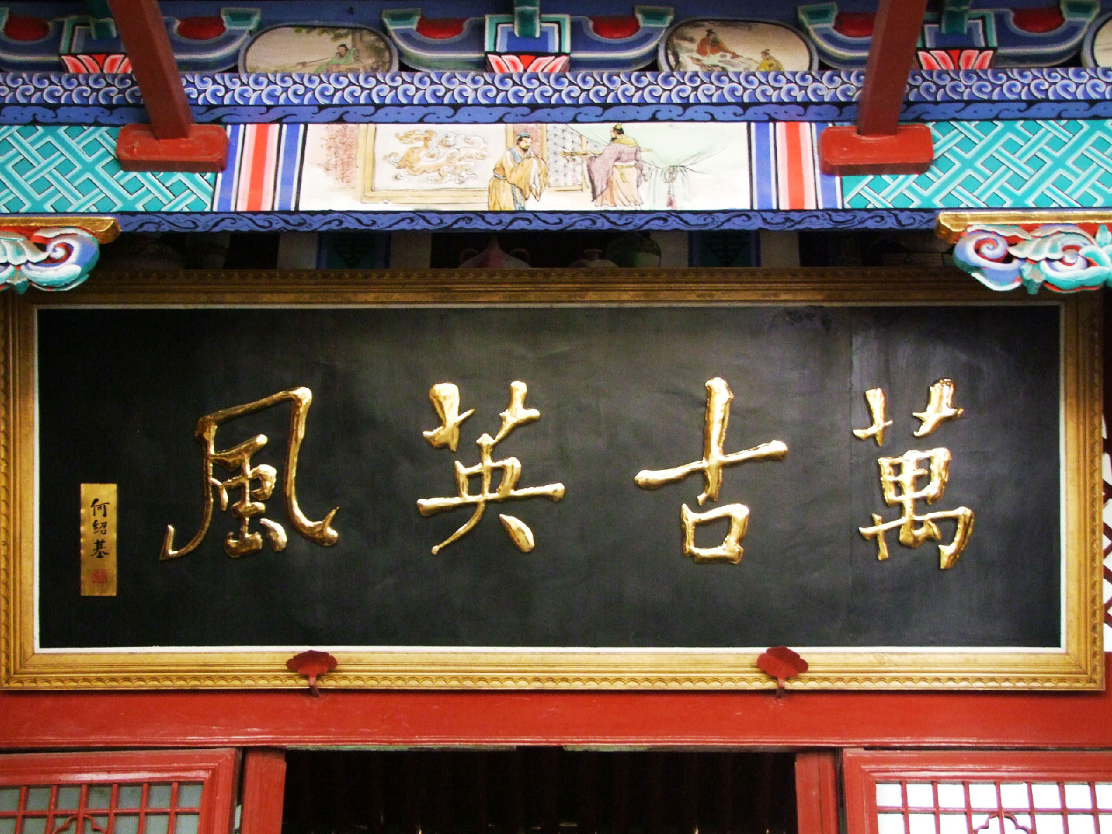 照壁的背后是他書寫的“忠、義、仁、勇”四個(gè)大字,成為會(huì)館一景,不少游人在此駐足留影紀(jì)念。