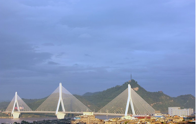 夷陵長江大橋毗鄰磨基山、橫臥長江,總投資6.1億元,于1998年11月28日動工。全長3246米,主橋長936米,橋面寬23米,是長江上唯一的一座三塔倒Y型單索面混凝土加勁梁斜拉橋,其跨度在同類橋梁中為世界之最。大橋在建設(shè)中先后運(yùn)用了20項(xiàng)新技術(shù)、新材料、新工藝。