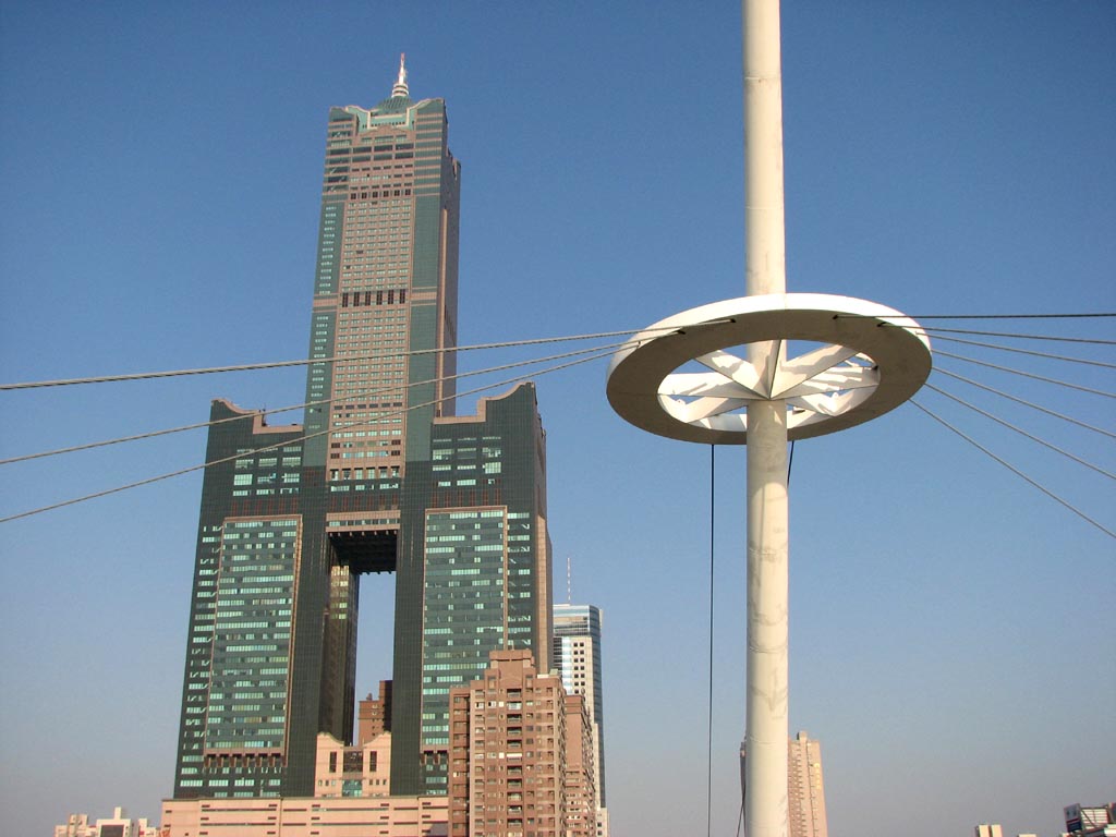 大樓擁有特殊的貫穿設計,左右兩棟建筑在35樓以上合并成單一的高塔,直到85層的尖頂,而在中央塔下方留下一個中空的空間。大樓的外型表現(xiàn)出所在城市的名字“高”(高雄)。