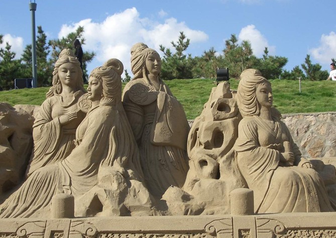 2002年9月被國(guó)家旅游局列為"中國(guó)民間藝術(shù)游重點(diǎn)活動(dòng)"的第四屆中國(guó)舟山國(guó)際沙雕節(jié)在浙江舟山群島朱家尖南沙隆重舉行。本屆沙雕節(jié)以"世界古代八大奇觀"為主題,以沙雕作品創(chuàng)作和展示為主要內(nèi)容,采用特大型組合沙雕的形式,向游客演示神奇的沙雕藝術(shù),展示我們這個(gè)星球文明的杰出代表之作。沙雕節(jié)整個(gè)沙雕景區(qū)由中國(guó)的萬(wàn)里長(zhǎng)城圍繞,內(nèi)部劃分為4個(gè)小廣場(chǎng),分別創(chuàng)作反映四大洲文明的歷史奇觀。具體作品內(nèi)容為:中國(guó)兵馬俑,埃及金字塔、獅身人面像和國(guó)王胡夫的故事,希臘宙斯雕像和眾神的故事,古巴比倫空中花園和通天塔,古代瑪雅城市,柬埔寨吳哥城,意大利中央大教堂和史前巨石群。