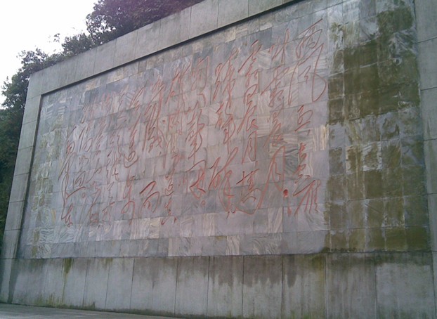 毛澤東填有《憶秦娥•婁山關(guān)》詞一首,描寫紅軍指戰(zhàn)員英勇鏖戰(zhàn)的壯烈情景?,F(xiàn)以行草手書體放大鐫于高14米,寬25米的大理石碑上,益增雄關(guān)聲色。