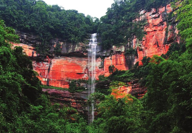 赤水的丹霞地貌,以其艷麗鮮紅的丹霞赤壁,拔地而起的孤峰窄脊,儀態(tài)萬千的奇山異石,巨大的巖廊洞穴和優(yōu)美的丹霞峽谷與綠色森林、飛瀑流泉相映成趣,形成很高的旅游觀賞價值,令游人傾倒。