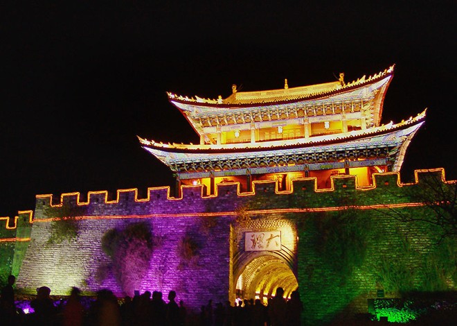 大理古城簡稱葉榆,又稱紫城,其歷史可追溯至唐天寶年間,南詔王閣邏鳳筑的羊苴咩城(今城之西三塔附近),為其新都?,F在的古城始建于明洪武十五年(公元1382年),方圓十二里,城墻高二丈五尺,厚二丈。東西南北各設一門,均有城樓,四角還有角樓。解放初,城墻均被拆毀。1982年,重修南城門,門頭“大理”二字是集郭沫若書法而成。 由南城門進城,一條直通北門的復興路,成了繁華的街市,沿街店鋪比肩而設,出售大理石、扎染等民族工藝品及珠寶玉石。街巷間一些老宅,也仍可尋昔日風貌,庭院里花木扶疏,鳥鳴聲聲,戶外溪渠流水淙淙。“三家一眼井,一戶幾盆花”的景象依然。古城內東西走向的護國路,被稱為“洋人街”。這里一家接一家的中西餐館、咖啡館、茶館及工藝品商店,招牌、廣告多用洋文書寫,吸著金發(fā)碧眼的“老外”,在這里流連忘返,尋找東方古韻,漸成一道別致的風景。