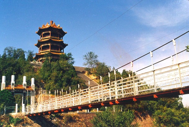 位于五龍峰東部約1.5公里處,主要游覽點有紫金閣、鐵索橋、牡丹園、月季園、植物園等。紫金閣分三層,高33米,每逢節(jié)日,紫金閣頂?shù)囊豢诤殓姂?yīng)和著黃河的波濤發(fā)出宏亮的聲響,聲聞數(shù)里。在岳山寺的懸崖峭壁之間架有一座鐵索橋,橋長40米,極為險峻。