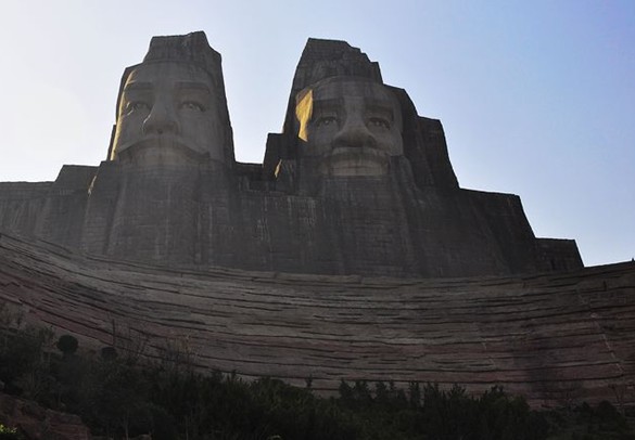 是目前國內(nèi)最雄偉的雕塑之一。它依山就勢,以山為體,82米高的整座向陽山作為像身,再在山頂塑造18米高的頭像,總高達到100米。構(gòu)思新穎,獨具匠心,不同凡響。二帝坐南朝北,背依邙山,面對黃河。巨像前是一個開闊場地,周圍遍植松柏,中間建筑祭壇。祭壇至塑像的軸線上建有長200米的神道,兩側(cè)各列四座鑄銅大鼎,連同山前一座共九鼎,寓意九州四方江山永固。廣場東西兩端擺放大型編鐘、銅鼓各一個。