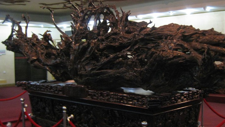 《中華根展覽》是由千年古樟巨根雕制而成。它長6.30米,高2.30米,其狀屈曲崢嶸,其勢鳳翥龍蟠,是為“養(yǎng)在深閨人未知”之珍寶。它鐫刻著女媧補天、夸父追日、大禹治水、赤壁賦等遠古傳說,歷代史事,英烈忠魂,前修偉業(yè),煌煌五千年文明史,盡覽于一根。洋洋灑灑百余構(gòu)圖,故事經(jīng)典,場面恢宏,造型傳神,栩栩如生,嘆為觀止。四周星羅姿態(tài)各異精品根藝80余類,根造型、根拼字、根貼畫、根包石、竹蔸雕……品類繁多,琳瑯滿目。每件根藝標(biāo)示牌均配以詩文,新穎別致,內(nèi)涵博深,耐人品味。觀者感慨:通觀此展,仿若閱讀一部歷史巨著,又似步入大千文學(xué)殿堂,更象闖進精美絕倫的藝術(shù)大觀園,不知不覺中,深受傳統(tǒng)美德和民族精神的熏陶。