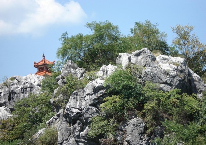 沿著依山小徑而行,一座數(shù)十米高的孤石峰凌空拔起,豎在眼前。峰巔上有塊巨石,酷似一個(gè)碩大無比的老人頭,故稱之人頭石。其面容憔悴,形象逼真,連眉眼、皺紋都很清晰,維妙維肖。峰下有一洞,名錦繡洞。洞中可容十多人,并有天然石桌石凳,供人休憩。洞外有一股清泉,常年不斷地流入洞中。進(jìn)入洞中有置身仙境的意趣。