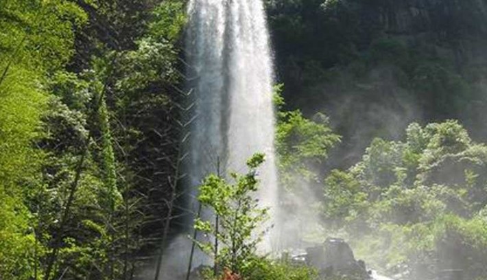 瀑布高200多米,上窄下寬,活似從天邊撒下的一具銀線網。是猛洞河最大的瀑布。它是一條水量豐富的小河,在此處突然失去河床的依托,水流飛奔直下,臨空跌落到底下的陡坡上,然后呈弧行展開,直飛到司河。此瀑布近觀滔滔、涸霧朦朧、凌空習墜、漫天飛珠,奔騰直下。流水傳說,這里原來沒有瀑布,只是一山石壁高聳藍天。壁下只有這具隋園形澄潭。古時候,潭中魚妖成群,作惡多端,其中一黑魚妖,每每掀翻船筏,攬人落水,以供餐食,據說在這里翻船破筏的人落水后沒有一個人能出來。人們苦叫這里為落水坑,年復一年,人們無奈,求上天保佑,于是玉皇派觀音下塵明查,查知黑魚作祟便揮手出線,招手成網,一句咒語,黑魚妖落入網中,為了讓世人咄言黑魚,便將黑魚掛在石壁之上,遺臭萬年。觀音走后,魚網變成了這個大瀑,故名落水坑瀑布?,F遠觀瀑布還可看到淹留在瀑內的黑魚,隱隱約約在流水下閃動,那情景象是在緩緩向上游呢。