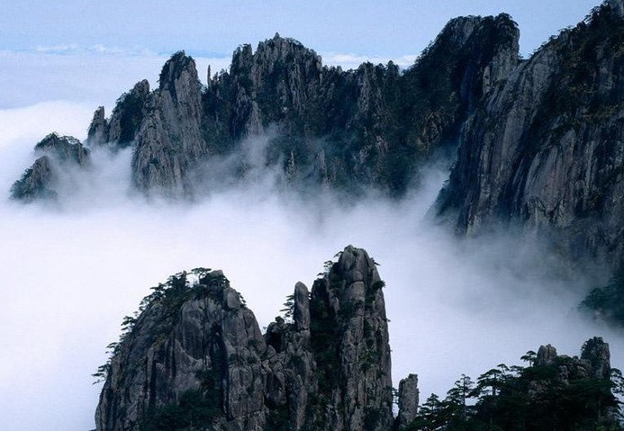 云海:晴空萬(wàn)里時(shí),白云從千山萬(wàn)壑中冉冉升起,蒼茫的云海猶如雪白的絨毯,緩緩地鋪展在地平線上,光潔厚潤(rùn),無(wú)涯無(wú)邊。山風(fēng)乍起時(shí),云海四處飄移,群峰眾嶺變成云海中的座座小島;云海聚攏過來(lái)時(shí),千山萬(wàn)壑隱藏得無(wú)影無(wú)蹤。云海時(shí)開時(shí)合,恰似“山舞青蛇”,氣象十分雄偉。
