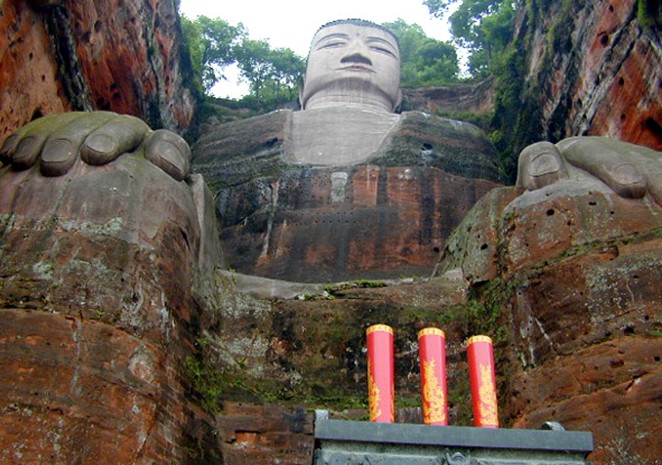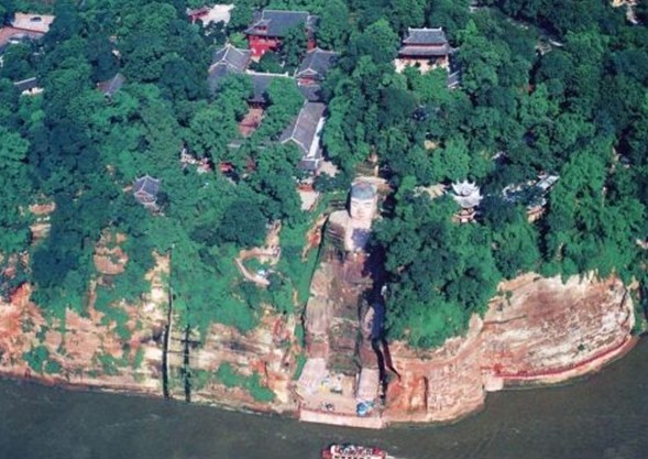 在風(fēng)景壯麗的四川樂山,在大渡河、青衣江、岷江的合流處,端然正坐著一座高達(dá)七十多米的佛像,它比號稱世界第一大雕刻的阿富汗帕米央大佛站像,還高二十多米。在樂山大佛頭的螺髻上面可以容十多人圍坐,耳朵空隙可并立兩人,雙足相距近十丈,兩個人接臥也不及大佛的一個腳趾長,一個人站立腳旁也未能高出腳面。隔江遙望,才能觀看到大佛的全貌。