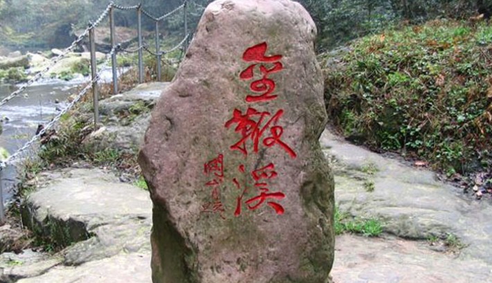 4、醉羅漢:與金鞭巖隔溪對峙,矗立在斜坡上,高200余米。 上下一般粗壯,峰體渾圓,色赤,整座石峰向金鞭溪呈70度傾斜,形似一醉酒羅漢,欲倒不倒,似醉非醉,詼諧幽默,發(fā)人情趣。自峰下向上仰望,但覺云移峰晃,感覺隨時都要崩塌之感。 清嘉慶年間學(xué)士彭之 臣在峰壁書寫一“忠”字。清道光四年(1824),貢生彭之運作《壁忠記》一文以彰其勝。風(fēng)雨滄桑,“忠”字因山石崩塌遭毀。