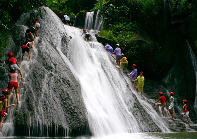登瀑布是勇敢的活動雖然沒有大的危險,但是要游客出體力,跟在別人往往是水濺一身,下水急攀登較難,雙腳輪流向上攀登,后面有人催游客,越是想往上爬,越是走不起來,手抓鐵鏈在空中搖擺著;偶爾后邊的人會幫上面的人扶一下腳,共同協(xié)作攀登困難者,也是團結(jié)協(xié)作的團隊精神;沿小溪而上,水有深有淺,第二道瀑布明顯比第一道要小得多,故快速而過,