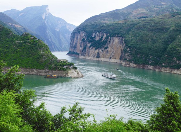 瞿塘峽長(zhǎng)8公里,是三峽中最短的一個(gè)峽。我想它應(yīng)該也是雄偉險(xiǎn)峻的一個(gè)峽。 端入口處,兩岸斷崖壁立,相距不足一百公尺,形如門(mén)戶,名燮門(mén),也稱(chēng)瞿塘峽關(guān),山巖上有“夔門(mén)天下雄”五個(gè)大字。左邊的名赤甲山,相傳古代巴國(guó)的赤甲將軍曾在此屯營(yíng),尖尖的山嘴活像一個(gè)大蟠桃,右邊的名白鹽山,不論天氣如何,總是迂出一層層或明或暗的銀輝。瞿塘峽雖短,卻能“鎮(zhèn)全川之水,扼巴鄂咽喉”,有“西控巴渝收萬(wàn)壑,東連荊楚壓摹山”的雄偉氣勢(shì)。古人形容瞿塘峽說(shuō),“案與天關(guān)接,舟從地窟行”。