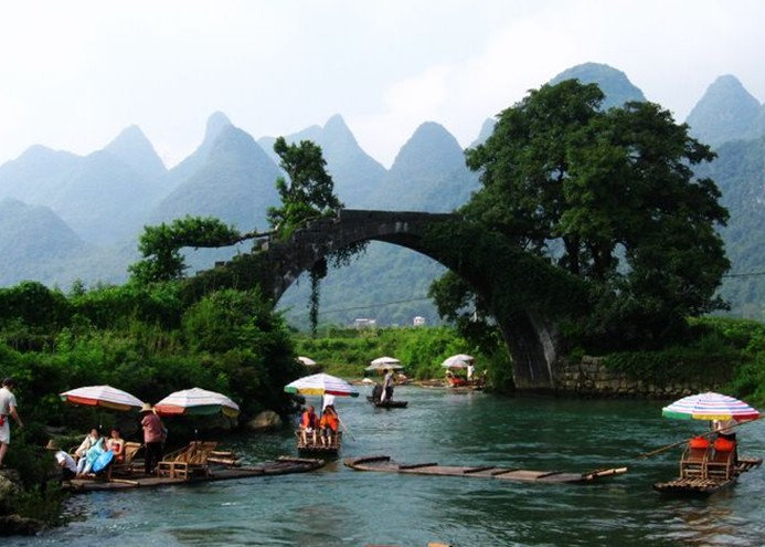遇龍河是漓江在陽朔境內(nèi)最長的一條支流,全長43.5公里,流域面積158.47平方公里,流經(jīng)陽朔縣的金寶、葡萄、白沙、陽朔、高田等5個鄉(xiāng)鎮(zhèn)、20多個村莊,人稱“小漓江”,不是漓江勝似漓江。尤其是從遇龍橋到工農(nóng)橋15.36公里水程,有28道堰壩,景點百余處,整個遇龍河景區(qū),沒有任何所謂現(xiàn)代化建筑,沒有任何人工雕琢痕跡,沒有任何一點都市喧囂,一切都是那么原始、自然、古樸、純凈,實為桂林地區(qū)最大的純自然山水園地。