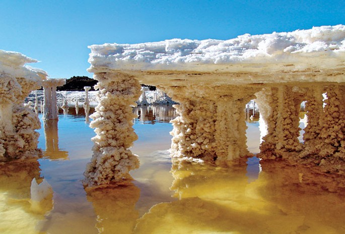 驅(qū)車(chē)行進(jìn)一段之后,司機(jī)師傅突然將車(chē)停下說(shuō):“萬(wàn)丈鹽橋到了。”筆者一行急忙跳下車(chē)去,爭(zhēng)睹這遠(yuǎn)近聞名的人間奇觀??烧Э粗拢}橋不過(guò)是一條普通的公路而已,和想象中的樣子相去甚遠(yuǎn)。經(jīng)介紹才知道,其實(shí)這條路是懸浮的,全由鹽晶筑成在湖面上,足有幾米厚,并與周?chē)匀唤Y(jié)成的鹽蓋連成一體,像是在平常的陸地上。鹽橋全長(zhǎng)32公里,折合市制可達(dá)萬(wàn)丈,因此而得名。有意思的是,路面的維修方法十分獨(dú)特,如果發(fā)現(xiàn)哪里有坑坑洼洼,只需從路邊鏟一點(diǎn)鹽來(lái)填平,再灑一點(diǎn)鹵水就平整如初了。