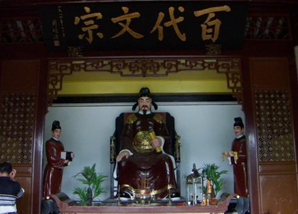 這邊的一副楹聯(lián),上聯(lián)是:辟佛累千言,雪冷藍(lán)關(guān),從此儒風(fēng)開(kāi)海嶠;下聯(lián)是:到潮才八月,潮平鱷渚,于今香火遍嬴洲。上聯(lián)說(shuō)他來(lái)潮州的緣由及到潮之后使讀書(shū)的風(fēng)氣遍及海濱。下聯(lián)說(shuō)他到潮州只做了八個(gè)月的官,但驅(qū)除鱷魚(yú),功德無(wú)量,歷代都沒(méi)有忘記他。