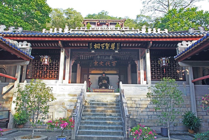 韓祠正門,上面寫著“韓文公祠”四字,是1984年胡耀邦總書(shū)記視察潮州所留下的手跡。韓祠依山而建,層次分明,前落是韓祠的主體,后落是侍郎閣,現(xiàn)在我們拾級(jí)而上,石階一共有51級(jí),是紀(jì)念韓愈51歲時(shí)到潮州。韓祠前原有韓愈手植橡木,民間傳說(shuō):橡木開(kāi)花的多少,可以預(yù)示當(dāng)年科舉考試錄取率的高低。韓祠橡木后來(lái)成為潮州八景之一。