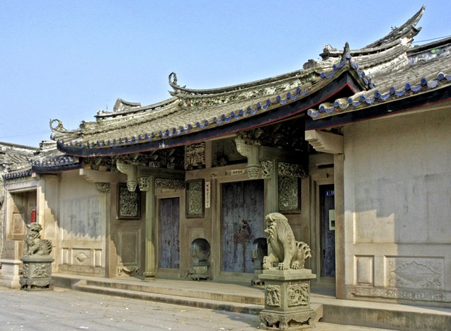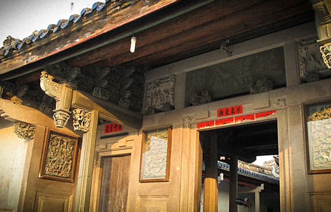 琳瑯滿目的建筑裝飾,使整座建筑物顯得更加富麗堂皇,首進(jìn)門樓前理分置精致石獅一對(duì),門樓屋架為雙面鏤空石雕。而最令人嘆為觀止的還是鑲嵌于門樓石壁上的四幅石雕.這四幅石雕分別以土農(nóng)工商,漁樵耕讀,花鳥蟲魚為題材,每幅石刻都很好地運(yùn)用了“之”字形的構(gòu)圖,將不同時(shí)空的人、事、物集中在同一畫面,濃縮故事情有節(jié)。表現(xiàn)最富戲劇性的瞬間。