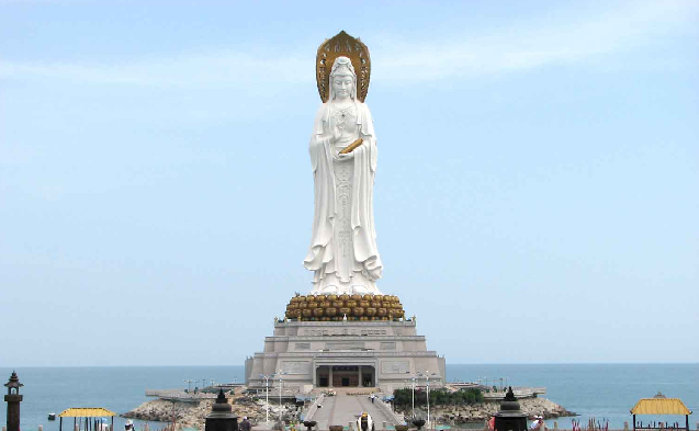 三亞南山海上觀音圣像敬造工程因其規(guī)模宏偉、意義殊勝、佛理底蘊(yùn)豐富,被譽(yù)為“世界級、世紀(jì)級”的佛事工程。像體為正觀音的一體化三尊造型,寶相莊嚴(yán),腳踏一百零八瓣蓮花寶座,蓮花座下為金剛臺,金剛臺內(nèi)是面積達(dá)15000平方米的圓通寶殿。金剛洲由長280米的普濟(jì)橋與陸岸相連,并與面積達(dá)60000平方米的觀音廣場及廣場兩側(cè)主題公園,共同組成占地面積近30萬平方米的“觀音凈苑”景區(qū)。
