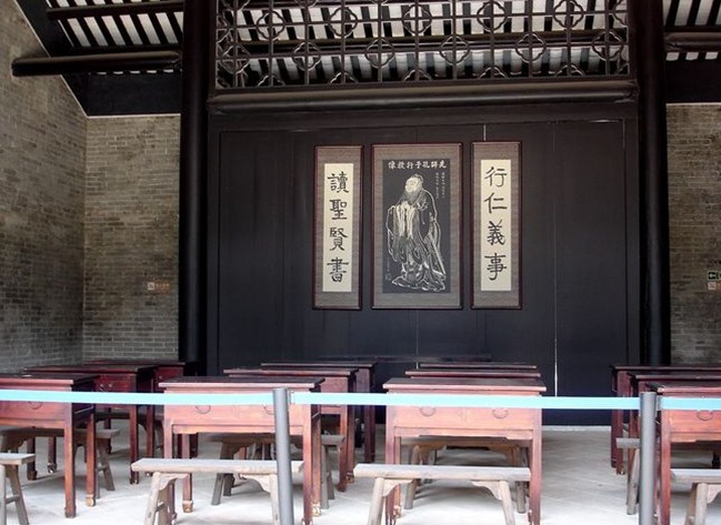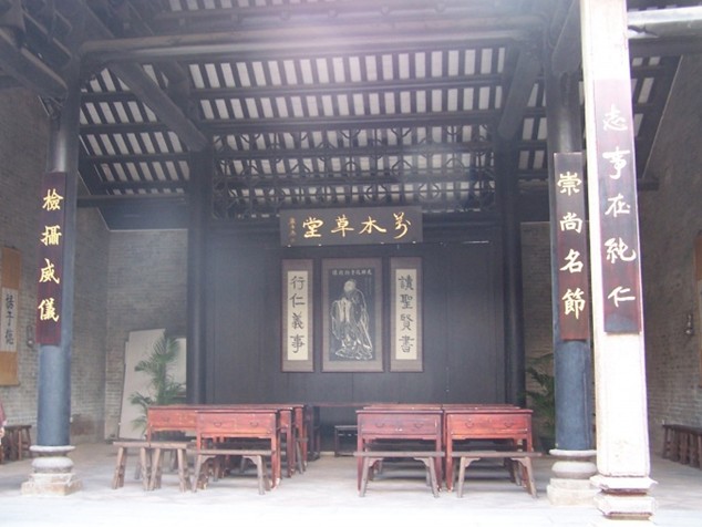 草堂,位于中山四路 長興里3號。是中國近代資產(chǎn)階級維新派創(chuàng)辦的著名學(xué)堂。原為邱氏書室,是廣東省邱氏子弟到省城應(yīng)試的居住處。萬木草堂原為邱氏書室,建于清嘉慶九年(1804),為三間三進、兩天井、硬山頂?shù)撵籼檬浇ㄖ?。碌灰筒瓦,兩邊保留有部分灰塑,青磚墻石腳,磚木結(jié)構(gòu),面闊三間15.8米,深三進35.3米,面積約為663平方米。