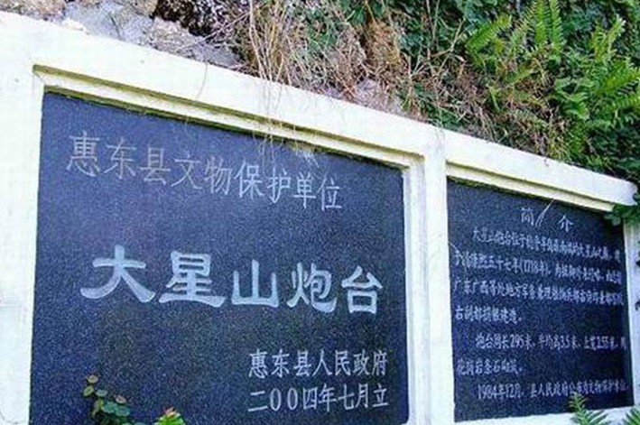 大星山炮臺位于港口鎮(zhèn)最南端的大星山西南面,是平海諸炮臺中保存得相當(dāng)完好的炮臺。東、西、南三面臨海,地勢險要,易守難攻,是歷代兵家必爭之地。鴉片戰(zhàn)爭前夕,帝國主義列強(qiáng)不斷派兵侵略中國,為抵御外來侵略,清康熙五十六年(1718年),廣東、廣西地方軍務(wù)兼理糧餉兵部右侍郎兼都察院右副都等捐銀在此建造炮臺,筑成軍事要塞。炮臺用麻石砌筑,周長295米,平均高3.5米,寬2.55米。