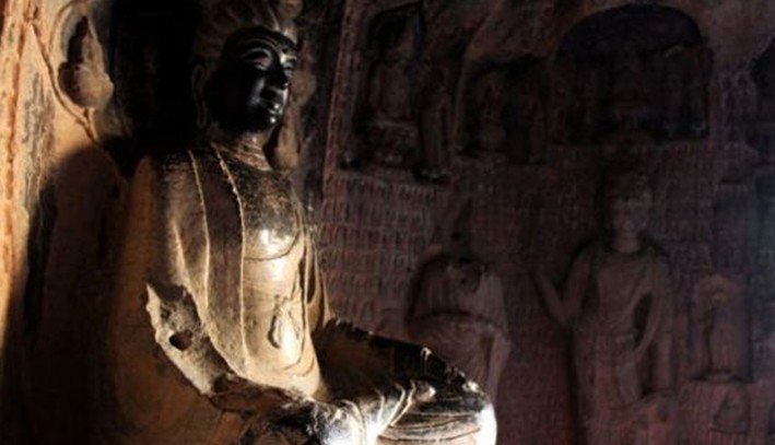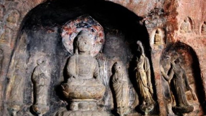 菩提樹下悟道、普濟(jì)眾生等佛傳故事。東南壁雕有佛像24尊,東北壁有16尊。雕像比例協(xié)調(diào),刀法流暢,質(zhì)感強(qiáng)烈,尤其是頭、手、足的造詣達(dá)到了很高的藝術(shù)境界,是雕塑藝術(shù)珍品。窟北壁前側(cè)為藥師佛,高2.55米。藥師佛左手持缽,右手施“療病印”,旁為七級(jí)浮屠,塔下為兩比丘,作昂首仰望狀。藥師佛上方為相向馭風(fēng)而行的飛天像。一飛天右手托缽,一飛天左手托缽,均乘如意云朵。