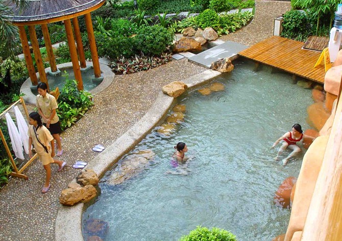 依山而建的古兜溫泉,集山、泉、湖、海為一體,風景優(yōu)美,有著豐富的溫泉資源,在古兜山下新近落成的溫泉谷,格調高雅,打造出一個不同凡響的溫泉王國。溫泉谷中間有一條約150米長的人工鵝卵石河道,它不僅為景區(qū)增添了春山幽谷的野趣,更和中央水區(qū)的大舞臺及各大小泡池相連,將谷內建筑群落自然分成了三大區(qū)域:北邊是歐式風格的“羅馬殿”,東邊則是日本和式風格的“東瀛閣”,南邊是“唐宮”。