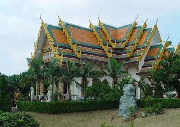 大殿總高19米,建筑面積490平方米。墻為白色,屋角、窗頂尖形,瓦似魚鱗并染青或黃色,屋檐頂端配有一支支向天的黃色裝飾圖案,新穎壯觀。內(nèi)部布置莊嚴,有精美的壁畫《佛陀的故事》,但沒有中國通常的三如來或西方三圣,僅有一尊泰式跏跌坐式大型銅鑄佛陀圣像,連同蓮座高3米余,重1.5噸,金光閃閃,妙相莊嚴。東殿供奉一尊護法尊者(即四面佛)像。這位護法神,即是大梵天,本是婆羅門教,印度教的創(chuàng)造之神。