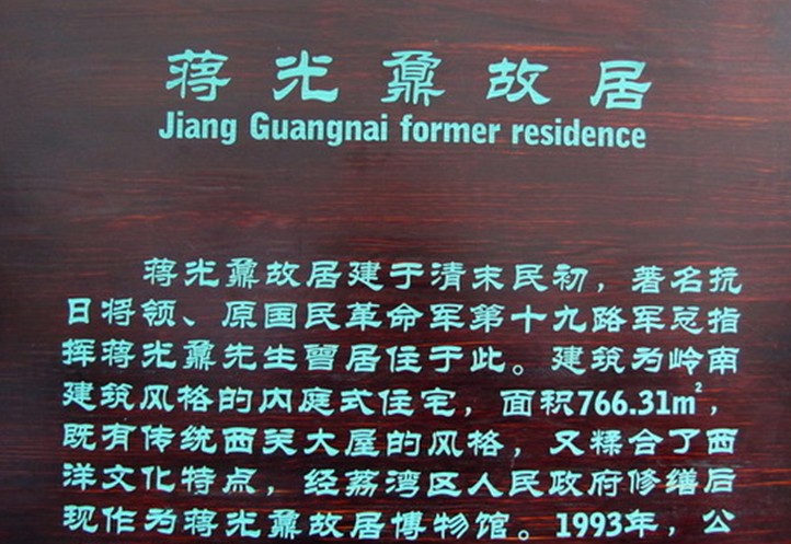 抗日名將蔣光鼐故居,又名荔蔭園,坐落在虎門鎮(zhèn)南柵村三蔣自然村。是一座造型典雅的西洋別墅式園林建筑。總面積1551平方米,遍植荔枝、龍眼、玉蘭等樹木,園內(nèi)果樹蔽日,爭來一片難得的蔭涼。荔蔭園的大門橫匾上刻有“荔蔭園”三字,門左右是一副對聯(lián):“造廬誰道龍猶臥,題戶應(yīng)嗤鳥是凡”。字體剛勁飄逸,神采飛揚(yáng),大有金戈鐵馬秋風(fēng)起的意思。