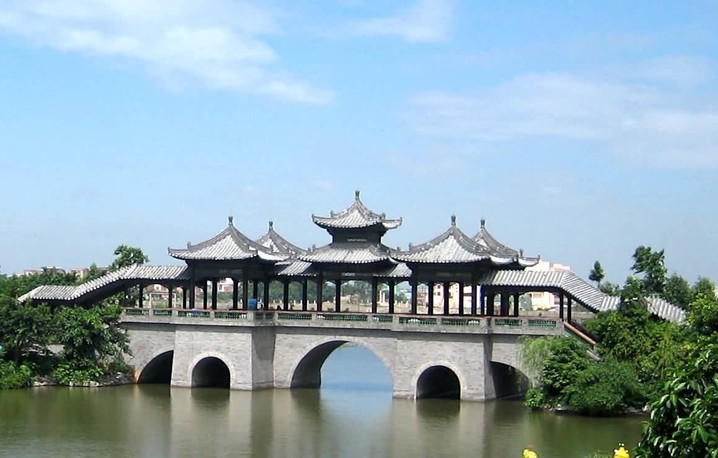 粵暉園歸水橋位于無香湖與映月湖交接的堤岸上,下設(shè)水閘,勢(shì)納東江,隨東江潮汐而變,換凈園水,永葆園內(nèi)水質(zhì)長清,故稱歸水橋。有詩為證:“橋自東江歸碧水,園從正道入青蚨”。歸水橋獨(dú)具嶺南特色,形象豐富。橋上架五亭如梅花布置,橋身用青石砌成,下由十二個(gè)大小不同的橋墩組成十五孔,平面呈“工”字形,兩側(cè)加階梯,橋面上矗立琉璃攢尖方亭五座,正中的主亭為重檐,其四角為單檐。每逢月滿,從正側(cè)橋孔觀望,每洞各映一月,金色晃動(dòng),眾月襯橋,使湖景更為美麗。歸水橋也是接通繞翠廊的關(guān)口,橋面相對(duì)前園高出3米多,這樣即使無香湖四周景觀高低起伏,又使繞翠廊有層次感,高低疊立,倚橋亭遠(yuǎn)眺,視野開闊,園內(nèi)美景盡收眼底。正是“水應(yīng)園生,園因水活”。