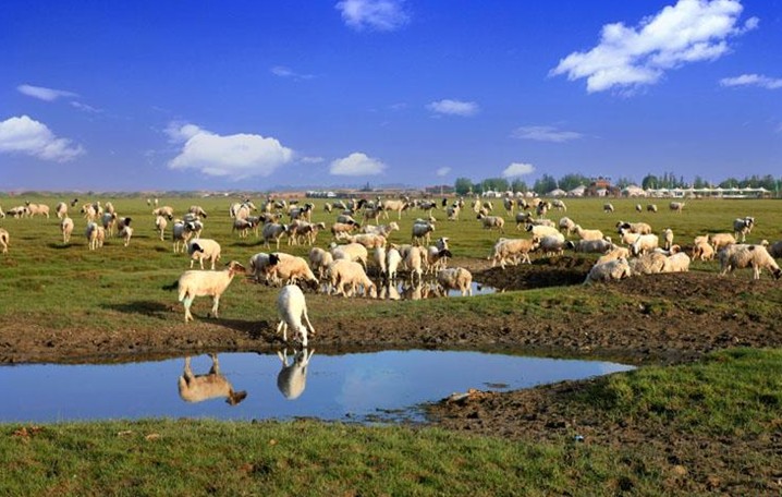 由駱駝山向南,進(jìn)入通湖草原。這里群沙環(huán)抱,綠草如茵,平湖如鏡,藍(lán)天白云之下,牧村、敖包、群群牛羊點(diǎn)綴其間,妙趣天成,如一塊碧玉鑲嵌在浩瀚沙海之中。