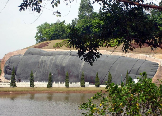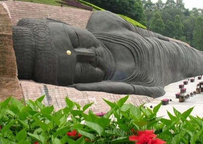 大臥佛位于森林公園天仙巖。相傳當(dāng)年佛教大師六祖惠能傳教后深夜經(jīng)過這里,看到天仙巖靈光閃爍,隱約可見這塊橫臥的大石塊就是一個大臥佛,六祖立即跪拜,求佛祖降福天下。大臥佛的雕造從這個傳說獲取靈感,以盛唐敦煌臥佛為范本,佛身長108米,尺度堪稱世界之最?,F(xiàn)經(jīng)改造用紫銅包裝大臥佛,成為金裝大臥佛。大佛前面是錦鯉池和荷花池,與大佛相互映襯引人入勝。大佛對岸一層為長六十米的長廊,廊內(nèi)彩繪佛傳故事,二層為敬佛臺,憑欄對拜,大佛全景一覽無遺。