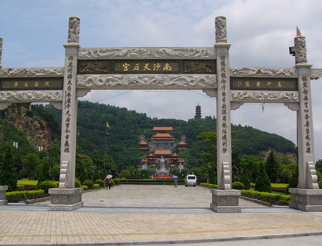 南沙天后宮,緊臨珠江出??诹尕暄?,坐落于大角山東南麓,依山傍水,其建筑依山勢(shì)層疊而上,殿宇輝煌,樓閣雄偉,在天后廣場(chǎng)正中就是石雕天后圣像,是為紀(jì)念海上女神林默而建,建筑特點(diǎn)是集北京故宮的風(fēng)格和南京中山陵的氣勢(shì)于一體,其規(guī)模是現(xiàn)今世界同類建筑之最,被譽(yù)為“天下天后第一宮”,也是東南亞最大的媽祖廟。天后圣像高達(dá)14.5 米,屹立在天后宮廣場(chǎng)正中。