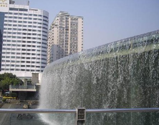 廣州火車東站及其廣場位于新城市中軸線的北段,東站綠化廣場以大面積的綠地營造了一個大尺度的環(huán)境空間效果,配以精致的花壇、雕塑、水景,體現(xiàn)了廣州現(xiàn)代化國際城市的都市風采。長89米、高8米的玻璃墻構(gòu)成了水景瀑布的依托,流水從高平臺溢出,順玻璃墻瀉入水池,各色燈光不斷變幻將瀑布映得五顏六色。