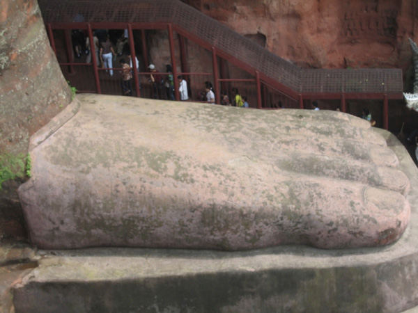 凌云山各峰上的寺宇,現(xiàn)在還保存的有棲巒峰的凌云寺和靈寶峰的靈寶塔。凌云寺規(guī)模頗大,大佛就鑿于離寺不遠(yuǎn)的崖上。從這里可以沿一條鑿于懸崖邊上的陡直小路,下到大佛的腳邊,在此憑欄看佛,可以仔細(xì)觀賞大佛頭部各個(gè)部位的細(xì)微之處。因?yàn)榇蠓痂徲诹柙扑虑?,所以大佛也就稱為凌云大佛。而凌云寺也因有了這尊大佛,而被人們稱為大佛寺。凌云山有了大佛,山更出名,大佛在凌云山上,山更增色。