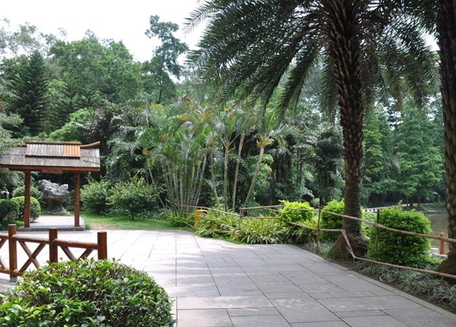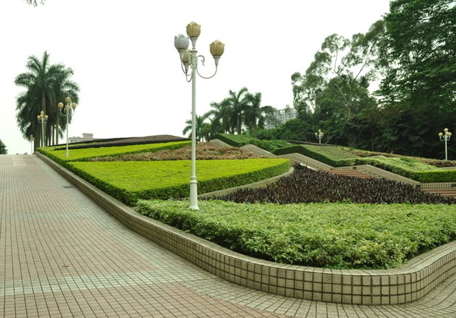 公園環(huán)境舒適,草坪舒展,山丘起伏,林木蒼翠,湖波粼粼,好一派自然清新的郊野風(fēng)情。氣勢(shì)宏偉的南北大門(mén)景色,門(mén)前廣場(chǎng)橫跨寬度達(dá) 100 米,建筑風(fēng)格獨(dú)特,植物色彩配置艷麗,布置緊湊,頗有現(xiàn)代公園氣派。最為壯觀的南門(mén)中軸廣場(chǎng),兩側(cè)種植風(fēng)景林,配置各類(lèi)棕櫚植物,襯托著中央的立體八角花壇,更加洋溢著嶺南園林的氣息。