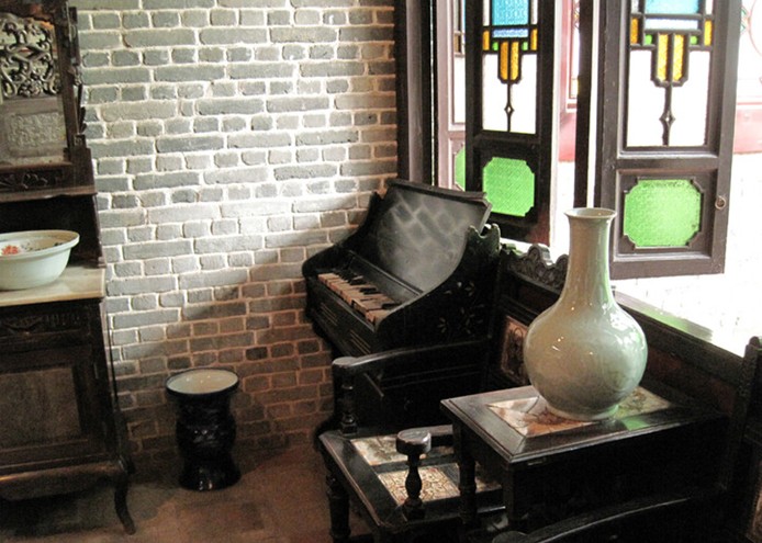 正廳東側(cè)是書廳,擺設(shè)仍然依照舊模樣,書桌、書柜、古董柜一應(yīng)俱全,書桌上擺放著毛筆、墨硯,墻上掛著古畫鏡框,透著濃濃的書卷味,一側(cè)桌上擺放著古老笨重的留聲機(jī),飄出的幽幽的音樂,應(yīng)該是周璇、白光她們的聲音了:紅著臉、跳著心,你的靈魂,早已經(jīng),在飄飄飄個不停!低婉沉醉,香甜軟糯。那是當(dāng)時的流行曲呢。